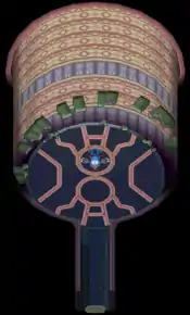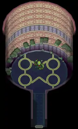 The appearance of the interior changes depending on which of the trio occupies it at the time. If Kyogre is in the room, the markings on the floor will be red and depict the pattern on Kyogre's fins. If Groudon is there, then the markings will be blue and show Groudon's arm patterns. If Rayquaza is occupying the Embedded Tower, then the markings will be yellow and represent those on Rayquaza's body.