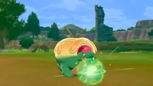 | The bushes on Grotle's back glow light green or white and it forms a green ball of energy in front of its mouth. Grotle then fires the ball at the opponent. | |||