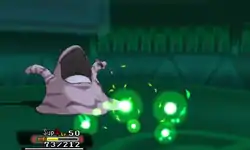 | Leavanny opens its mouth and its antennae glow light green. They also become surrounded by light green sparkles. A light green orb of energy then forms in front of its mouth and Leavanny fires it at the opponent. On occasion, green sparks of energy will surround the opponent, making it more vulnerable to special attacks. | |||