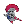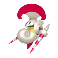 Escavalier is an insectoid Pokémon with a head sporting the red horsehair crest of a knight's helmet, with a visor underneath it. Its shoulders have large, round metal ridges, from which its thin black arms extend. The arms are tipped with red-striped protrusions resembling jousting lances. Its face and torso are bare of armor, but its lower body is concealed within a swirled gray shell with a red spike on the underside, which was presumably the shell of a Shelmet.