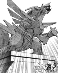 In Unplugging Rotom (Heat, Wash, Mow, Fan, Frost), Diamond and Pearl followed Rotom from the Old Chateau to the city, eventually befriending it. At the end of the round, Giratina created a portal inside the city and attacked it, destroying the statue. As Diamond's Regigigas started fighting against Giratina, Charon, on his quest to capture all the Legendary Pokémon of Sinnoh, sent his newly-caught Heatran out to fight Regigigas. When Giratina eventually re-entered the portal, Charon chose to abandon the fight, which wasn't even going in his favor anymore, and pursued Giratina into the Distortion World, followed by Saturn, Mars, and Jupiter, who had been observing the events and decided to try finding Cyrus from the other world, where he had disappeared into the at the end of the previous chapter.