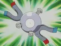 Later, after Ethan is hurt by Team Rocket, Ash is tasked with bringing the Magnemite to the next town. However, none of the Magnemite obey Ash and wander off. Pikachu manages to do Jolteon's job and brings all the Magnemite back, except Number 6. Ash finds it near a stream but Team Rocket are also there. They use static electricity to pull all of the Magnemite, including Number 6, which Ash is still holding onto. Pikachu attempts to corral the Magnemite back from Team Rocket, but the power of the static is too great. Seeing how hard Pikachu is fighting for the Magnemite, Number 6 collides with Team Rocket's electric ray and Pikachu's Thunderbolt absorbing both and freeing its fellow Magnemite. Suddenly it evolves into a Magneton and sends Team Rocket blasting off. Number 6's known moves are Thunder Shock and Thunderbolt. | ||
