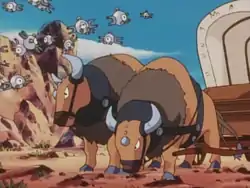 | Ethan has two Tauros, which pull his stagecoach so he can traverse Mandarin Island South. They first appeared giving Ash and his friends shelter from the Magnemite. After the attack by Team Rocket, one stays with the wagon, while the other is ridden by Ash as he travels to the next town with Ethan's Magnemite.