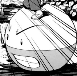 | Electrode is Eusine's first known Pokémon that serves as his mode of land transportation. It was first seen accidentally shocking Crystal's Archy after the two mistook one another for Suicune. While he faced the Team Rocket Elite Trio alone, Eusine lent Electrode to Crystal and had it take her to Ecruteak City. In the HeartGold & SoulSilver chapter, it was seen with Eusine while confronting Silver. Electrode later helped take care of the children left in Eusine's care.