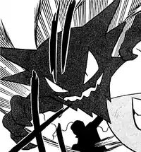 | Eusine sent out Haunter for the battle against the Black Tyranitar.