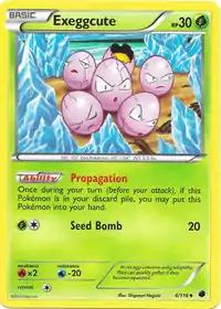 Exeggcute (Japanese: タマタマ Tamatama) is a Grass-type Basic Pokémon card. It was first released as part of the Plasma Freeze expansion.