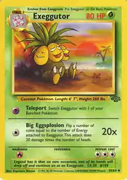 Exeggutor (Japanese: ナッシー Nassy) is a Grass-type Stage 1 Pokémon card. It was first released as part of the Jungle expansion.