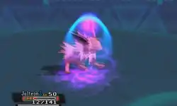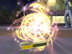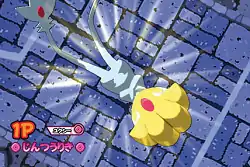 Uxie's eyelids glow gold and it fires a rainbow-colored beam from the gem on its forehead at the opponent. | ||