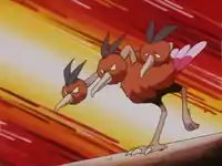 | Dodrio was the second Pokémon Falkner sent out to battle Ash's Pikachu. At first Dodrio seemed to have the upper hand. When Pikachu tried to attack, Falkner ordered Dodrio to fly - much to Ash's surprise - and Dodrio jumped high in the air. Ash then decided to use that method himself, and ordered Pikachu to dodge Dodrio's Tri Attack by jumping to the air. From above, Pikachu used Thunder, knocking out Dodrio and winning the round.