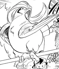It was then put up against Ash's Charizard in the final round of the battle. With its impressive speed and power, Pidgeot was able to gain the upper hand and injure Charizard making it unable to fly. But with Ash's support and inspiration, Charizard was able to fly again. Unfortunately, things still looked bad as Pidgeot used Agility to keep dodging Charizard's attacks and attack from behind. Ash luckily had Charizard turn back and use Fire Spin trapping Pidgeot. It then finished it off with Seismic Toss making Ash the victor. It reappeared in a flashback in All That Glitters!. Pidgeot's known moves are Whirlwind, Agility, Wing Attack, and Quick Attack. | ||
