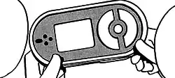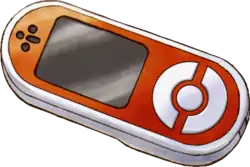 The Fame Checker has a simple design. It is dark red and has a screen roughly the size of the Pokédex screen. It has four black circular buttons on the left side, and on the right side it has a Poké Ball-shaped button or wheel split into three different portions.