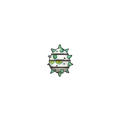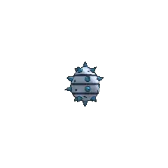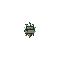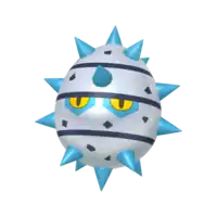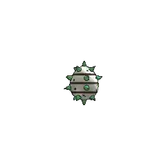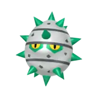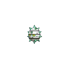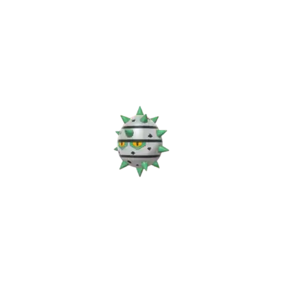 Ferroseed is a cave-dwelling Pokémon resembling a durian. It has many green thorns around its body that are used for protection. It has a metallic body with band-like stripes, along with small yellow eyes with black pupils.