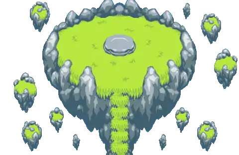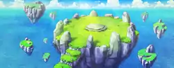 Final Island is a crag of mossy rock that appears to be floating in mid-air, which mimics Mew's ability to levitate. Other smaller rocks surround it, and there is a silver, circular pedestal in the middle.