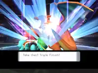 Triple Finish (Japanese: さんみいったい Trinity) is Pokémon Trainer's Final Smash. Pokémon Trainer will send out his two inactive Pokémon, who will join the active Pokémon to perform their strongest known moves together. As the move is prepared, a game-styled text box will appear at the bottom of the screen saying, "Take that! Triple Finish!" At this time, Charizard uses Fire Blast, Squirtle uses Hydro Pump, and Ivysaur uses SolarBeam. In Super Smash Bros. Brawl the text box is stylized to look like the one from Generation IV, while in Super Smash Bros. Ultimate the text box is stylized to resemble the one from Generation VII.