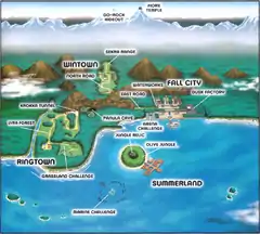 Fiore is a location with mountainous terrain and four cities located in the cardinal directions of the map. Each city represents a season: Ringtown for spring, Fall City for fall, Summerland for summer, and Wintown for winter.