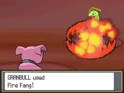 | Granbull opens its mouth and its mouth becomes surrounded in flames. It then bites down and the fire surrounds its bottom jaw and teeth. Granbull then bites down on the opponent. | |||