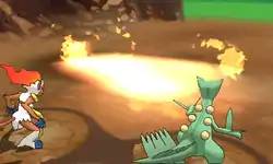 XYORAS A column of fire hits opposing Pokémon. When used with its grass equivalent, its damage increases and a vast sea of fire appears.