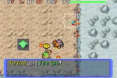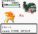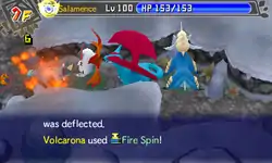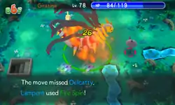 Fire Spin has a power of 15 and an accuracy of 70. Fire Spin inflicts damage and traps the target for 2-5 turns, damaging the target at the end of each turn. There is a 37.5% chance that it will attack for 2 turns, a 37.5% chance that it will attack for 3 turns, a 12.5% chance that it will attack for 4 turns, and a 12.5% chance that it will attack for 5 turns. Although only the first hit can be a critical hit, each consecutive turn will deal the same amount of damage. While the target is trapped, it will be unable to attack, and if the user of Fire Spin strikes before the target, when used, the target will also be unable to attack during the same turn.