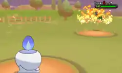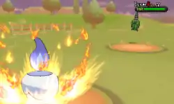 | Delphox lights the tip of its branch on fire and throws it at the opponent. | |||
