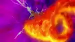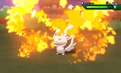 Ponyta kicks its two back feet outwards and the flames on its tail stretches and curves. Multiple orbs of fire surrounded in a fiery aura also shoot out of its mane and spin around in circles behind it. A huge horizontal vortex of fire then shoots out from Ponyta's body behind it. As the opponent becomes trapped in the vortex of fire, the orbs of flames dart around and hit the opponent as well. | ||