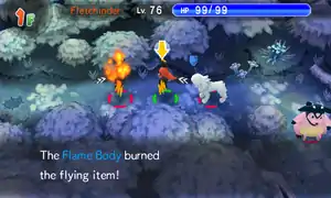 When the Pokémon is hit by a move that makes contact, there is a chance that the attacking Pokémon will become burned. In Pokémon Super Mystery Dungeon and Pokémon Mystery Dungeon: Rescue Team DX, Flame Body also causes any items thrown at the Pokémon to become burned, nullifying the effects of the thrown item. Thrown items that miss the Pokémon will not be burned.