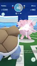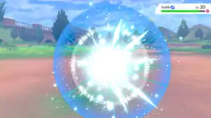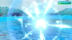 Duosion's entire body glows gold with silver sparkles around it. The silver sparkles grow larger and a gold outline appears around them as well. A golden orb of energy then forms in front of Duosion's body. The silver sparkles then sink into the orb, as well as the gold glow, and Duosion fires a white and light blue beam of energy from the orb at the opponent. | ||