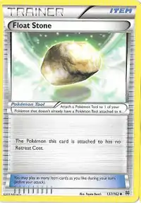 Float Stone was introduced as a Pokémon Tool card in the Pokémon Trading Card Game during the English Black & White Series (the Japanese BW Era) in the Plasma Freeze expansion, with artwork by 5ban Graphics. It was reprinted with artwork by Toyste Beach during the XY Series in the BREAKthrough expansion. This Trainer card causes the holder to have no Retreat Cost.