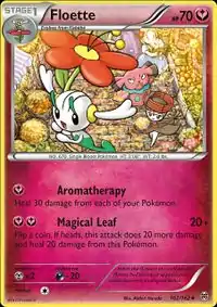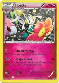 Aromatherapy and Magical Leaf are both moves in the Pokémon games that Floette can learn. This card's Pokédex entry comes from Pokémon Y.