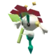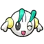 Floette is a small Pokémon with a white upper body and a deep-green lower body. Its eyes are black with a green, leaf-like extension over each similar to eyelashes. It has long, notched ears with a yellow ring around the base of each. Its tail is spade-shaped, and it has thin arms with mitten-like hands. It has two thin black lines on its head. It is a female-only species with no male counterpart.