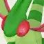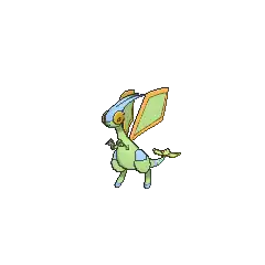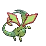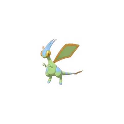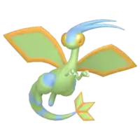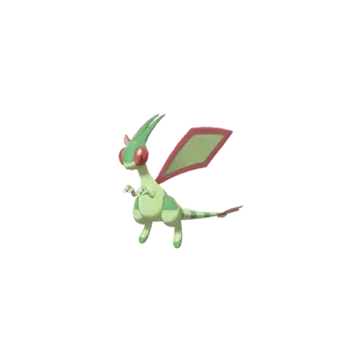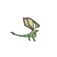 Flygon is a Pokémon that resembles a slightly insectoid, bipedal dragon. It is primarily light green and has a pair of large rhombus-shaped wings with red trim, toeless hind legs, and skinny arms with three-clawed hands. Flygon's tail has several dark green stripes and three small green rhombus shapes with red trims at the end. It has large eyes and a pair of green antennae that point back. Its eyes have red covers that prevent sand from getting into it. With its wings, it kicks up sandstorms to hide itself. Its wings make a "singing" sound when they are flapped, earning Flygon the name "The Desert Spirit". It uses this unique ability to attract prey, stranding them before it attacks. Flygon lives in the desert, and it typically works together with Krookodile in searching for food.