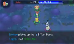 From Pokémon Mystery Dungeon: Gates to Infinity onwards, Follow Me warps 1 random enemy in the same room to the tile in front of the user, and warps allies nearby the user to surround said enemy.