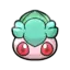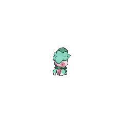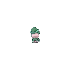 Fomantis is a small, plantlike Pokémon. It has large, dark pink eyes with slightly darker pupils. Bunches of light green leaves surround its head, and a particularly large tuft in front slightly overhangs its face. A small, dark green bulb sprouts from the center of its head, which emits a pleasant aroma. Around its neck is a collar of short, dark green leaves. Extending from its collar are four lighter green leaves with white tips: two in the front and two in the back. In the front, these leaves act as scythe-like arms. Its main body is pale pink with a thick, dark pink stripe down the front and back. It has a stubby tail and two short legs.