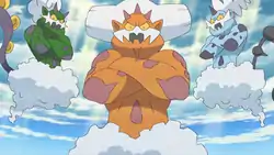 Iris, dressed up as a shrine maiden, summoned Landorus in Stopping the Rage of Legends! Part 2 with the help of Lewis's Gothorita in order to have Tornadus and Thundurus cease the fighting. He battled the two until Team Rocket and Dr. Zager arrived and caged the Forces of Nature with their energy fields. The energy fields were attached to Dr. Zager's helicopter. Ash, his friends, and Lewis tried freeing them with their Pokémon, but their attacks were rendered useless on the energy fields. They went for the helicopter instead and Dr. Zager released control of Landorus, Tornadus, and Thundurus, and fled along with Team Rocket. The battle between the Forces of Nature continued and Landorus struggled to avoid Thundurus and Tornadus's onslaught, which gave the two a chance to inflict damage on Landorus. Gothorita gave Landorus a Revival Herb to fully recover his strength. Now fully healed, Landorus fired a Hyper Beam at Tornadus and Thundurus. He was then finally able to convince the two to stop their fighting.