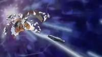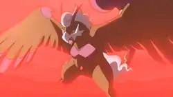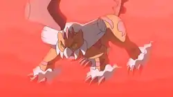 In Unova's Survival Crisis!, Giovanni used the Reveal Glass to summon the trio, force them into their Therian Forme and control them. He battled aggressively in the skies with Iris's Dragonite, Cynthia's Garchomp, Ridley's Golurk and Cilan's Pansage under Giovanni's command and were still unable to control himself even after Team Rocket fled the scene. Eventually he was calmed by Meloetta's song and turned back to his Incarnate Forme before leaving.