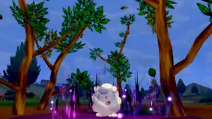 Phantump's eyes shine, and a ring of the same color shoots out of their eyes and hits the ground. The ground grows purple and purple vines grow out from it to constrict the opponent, turning the opponent into a Grass type. | ||