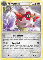 Forretress (Japanese: フォレトス Foretos) is a Metal-type Stage 1 Pokémon card. It is part of the Undaunted expansion.