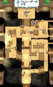 The Gym's passages are blocked by rotating doors that turn when the player walks through them, requiring the player to backtrack and go through certain gates multiple times to access the Gym Leader (and thus in Ruby and Sapphire, none of the Gym's Trainers can be avoided). A group of ledges can be used as a shortcut to get back to the entrance.