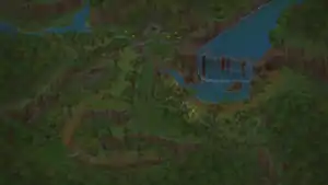 "This dense jungle is home to an ancient, enormous tree as well as a waterfall. Fleeting glimpses of Pokémon can be seen through the gaps in the thick tangle of trees."