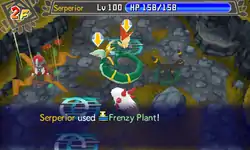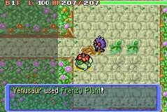 In Red Rescue Team and Blue Rescue Team, Frenzy Plant is a move with 30 base power, 10 PP and 84% accuracy. The user targets enemy in front, cutting corners. If the move hits target successfully, the user is inflicted with Paused status condition for 1-2 turns, preventing them from acting on these turns.