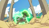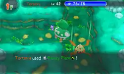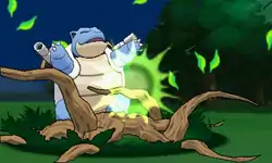| Torterra's body becomes outlined in green and it slams its front two legs into the ground. Giant roots with spikes on them come out of the ground and strike the opponent. | |||