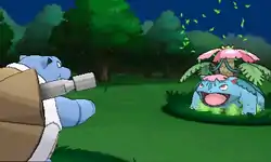 Venusaur's body becomes surrounded in an aura and it releases two energy beams from the sides of the flower on its back at the opponent. The beams twist around each other as they fire at the opponent. Eventually, the energy around the beams fade into two giant roots with large thorns on them, or two powerful and large vines come out of underneath the leaves on Venusaur's back and hit the opponent. | ||