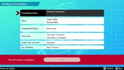 Friendly Competitions can be created through the Pokémon Global Link website. There are two formats of Friendly Competitions: the online format and the live format. For online format competitions, a player must enter the competition on the PGL website and scan the generated Friendly Competition QR Code in the Battle Spot in Festival Plaza. Battles will take place over the internet. For live format competitions, a player must select Live Competition on the main menu to scan the Live Competition QR Code. Battles will take place over infrared.