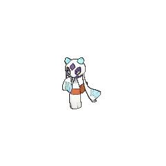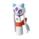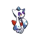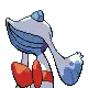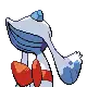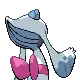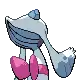 Froslass is a humanoid Pokémon with a hollow torso that resembles a kimono. It wears a red band around its waist, reminiscent of an Obi. Its body lacks feet and it floats in the air like its counterpart, Glalie. Its arms are connected to the sides of its head and flare at the wrists. The flared portion has a dappled light blue coloration. Its hands consist of three small fingers. Froslass's head is shaped similar to a sideways water droplet and is topped with two ice crystals that resemble horns. Its head has several holes on it, resembling a mask. Through two of these holes, crystal blue eyes with yellow sclerae can be seen. It also has a mouth below this "mask".