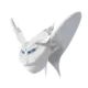 Frosmoth is a white, moth-like Pokémon with a round body, of which the upper half is thicker, giving it the appearance of a ruff. It has deep blue eyes and long eyelashes. It has a blue jewel between its eyes and two long antennae, which are grey at the tip with trapezoid patterns. Frosmoth has two large wings which a grey with a white rim, the patterns on its wings are the same as that on the tip of its antennae. Frosmoth typically keeps its arms crossed, and its usually obscured palms each have a heart-shaped pad.