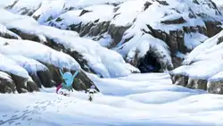 The Frost Cavern appeared in Over the Mountain of Snow!. Team Rocket tried to get shelter there, but were attacked and subsequently blasted off by an angry Abomasnow. Ash and his friends soon arrived at the same location, and discovered that Abomasnow was merely trying to protect a sick Snover inside the cave. The group then proceeded to split up into pairs in order to find ingredients for a medicine needed to cure Snover. Ash and Serena ventured deeper into the Frost Cavern to find Spring Moss, while Clemont and Bonnie explored its surrounding areas for Mountain Marigolds. When the two medical plants had been found, Clemont was able to mix them into a medicine that cured Snover.