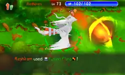 Reshiram fires a large sphere of flames with two rings surrounding it from its mouth at the opponent. | ||