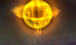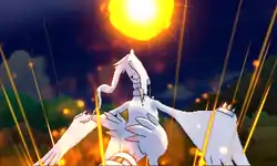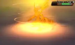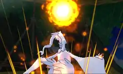 Reshiram fires a giant orb and it rises above. The orb lowers and hits the opponent. A trail of light is left behind while the orb hits. | ||
