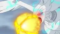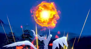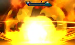 Reshiram fires a large sphere of flames with two rings surrounding it from its mouth at the opponent. When the sphere hits, it creates a violent explosion. | ||