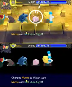 In Red Rescue Team and Blue Rescue Team, Future Sight is a non-damaging move with 13PP. The user will give itself Set Damage status condition for 3-4 turns, causing all of user's attacks to deal 35 damage, regardless of other multipliers. Being a non-damaging move, it is affected by Taunt.