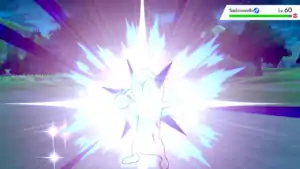 Mesprit raises its hands into the air and a light blue ball of energy with light blue sparks of electricity surrounding it appears above them. Light blue light bolts then fire from the ball into the sky and disappear. After a while, light blue lightning bolts appear and shoot out of the sky, hitting the opponent. | ||
